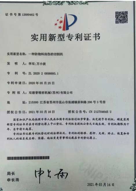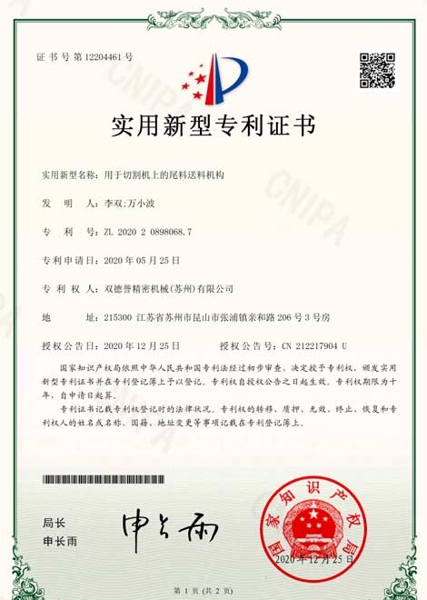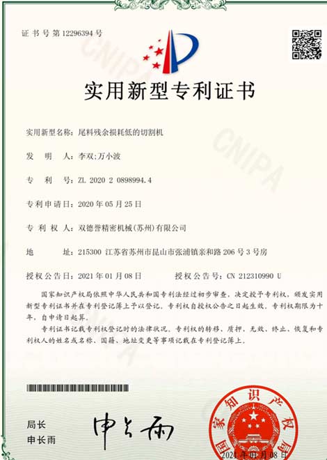 尾料殘余損耗低的切割機實用新型專利證書